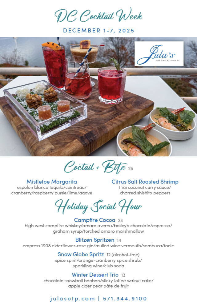 We’re featuring a Cocktail + Bite for $25, plus $2 off an array of holiday cocktails and our new winter dessert trio. Reservations are offered via OpenTable or visit our website, julasotp.com.